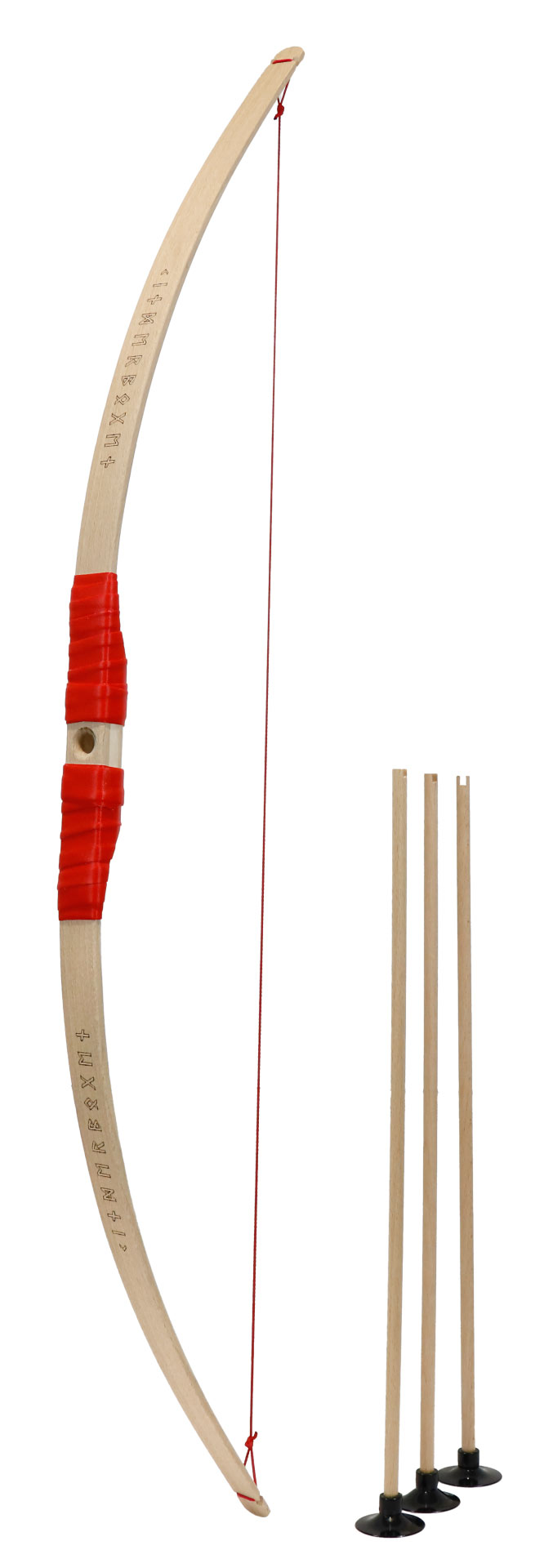 Barnbåge i bokträ med hål och lasergravyr – färgad grepp + 3 träpilar