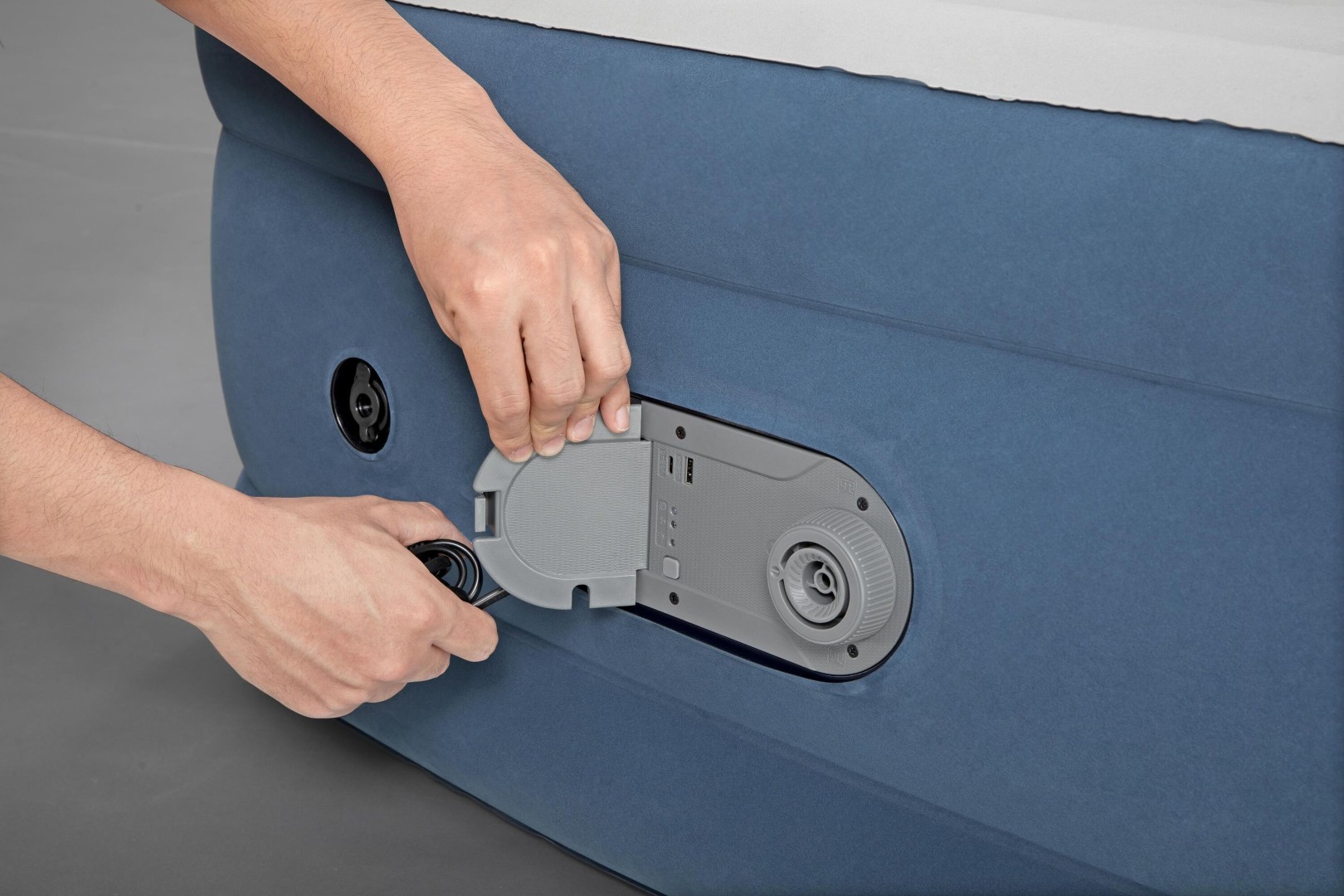 AlwayzAires dubbla pump ser till att din luftmadrass förblir uppblåst hela natten. Interna sensorer övervakar lufttrycket och pumpen blåser tyst upp luftmadrassen igen medan du sover för att bibehålla den avsedda fastheten så att du aldrig vaknar på marken. Det dubbla pumpsystemet blåser upp luftmadrassen på bara 3 minuter, vilket minskar luftförlusten och eliminerar överuppblåsning. Den har också USB-portar för enkel och bekväm laddning av smarta enheter. För bästa resultat måste luftmadrassen vara inkopplad hela natten. Ingen ström, inga problem - den här luftmadrassen är också kompatibel med handhållna pumpar för uppblåsning, men det krävs elström för att de dubbla pumpsensorerna ska fungera korrekt.