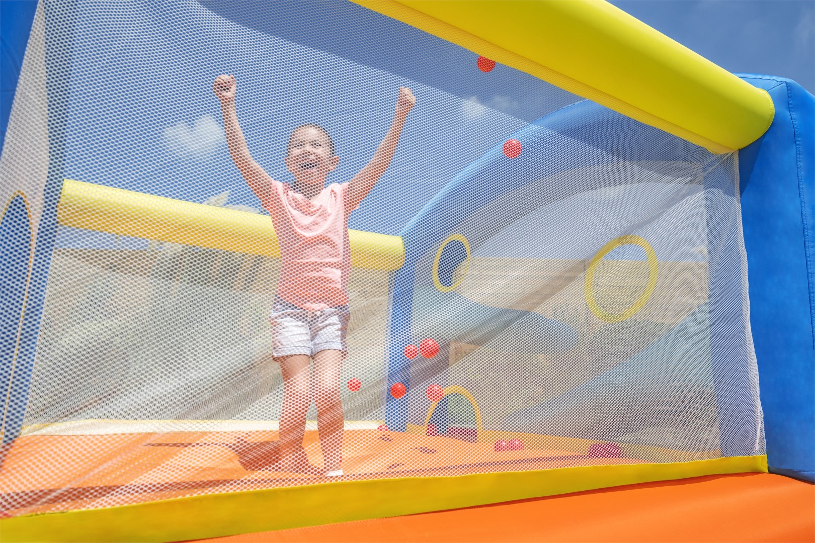 Packa upp en gymnastiksal full av kul med H2OGO!® Leap & Play™ Mega studsmatta! Den medföljande fläkten blåser upp och tömmer studsmattan på några minuter, vilket sparar tid och ansträngning för föräldrarna! Denna lättmonterade studsmatta har också massor av säkerhetsfunktioner som föräldrar kommer att älska. Sidoväggarna i nät håller barnen säkra samtidigt som föräldrarna kan se dem hela tiden. Med en öppning för in- och utgång kan barnen susa nerför den extra breda rutschkanan medan föräldrarna tittar på. Längs bakväggen finns ett roligt bollspel som gör att barnen kan ha roligt samtidigt som de tränar sin finmotorik. Denna studsmatta kan användas inomhus eller utomhus och ger barnen en rolig, säker plats att utforska och leka på. Medan de studsar och leker stimulerar de också sin fantasi och stärker sitt självförtroende och sin kommunikationsförmåga. De kommer att ha så roligt att de inte ens märker att de lär sig något! H2OGO! Leap & Play Mega Bouncer är den perfekta leksaken för många timmars lek året runt.