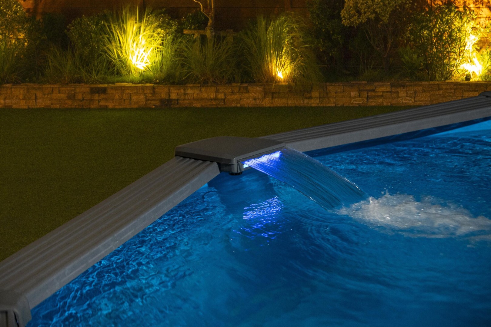 Flerfärgat vattenfall (3 AA-batterier ingår ej); 8,327 l långlivad sandfilterpump med 500 g Polysphere-filtreringsbollar för effektiv, lätt filtrering; Poolskimmer för att samla upp skräp innan det når pumpen; ChemConnect kemikaliedispenser; Stege i galvaniserat stål till poolen; Bottenduk; Poolskydd