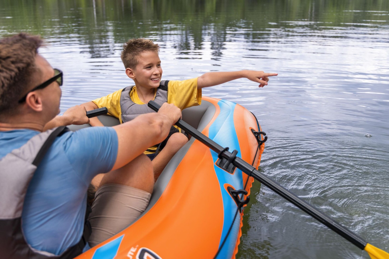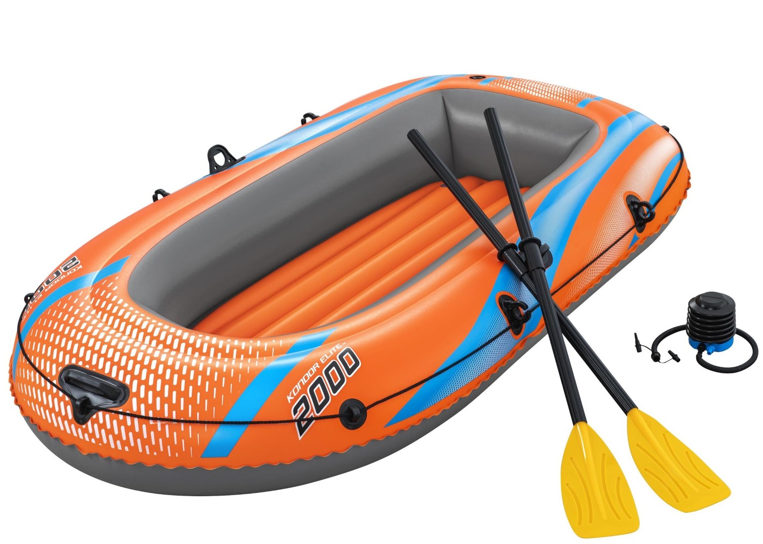 Bestway® Kondor Elite™ 2000 är en uppblåsbar jolle som är en fröjd för familjer som vill utforska vattnet tillsammans! Den är perfekt för ett barn och två vuxna (med en total viktkapacitet på 120 kg), har en väl synlig orange färg och är lätt att blåsa upp, så att du kan lägga mindre tid på att ställa i ordning och mer tid på vattnet. Den uppblåsbara båten har ett extra lager av skydd med sin konstruktion med dubbla luftkammare och ett bekvämt uppblåsbart golv som är perfekt vadderat för extra avkoppling och stabilitet. Handtaget på framsidan av den uppblåsbara båten garanterar bekväm transport runt sjön eller poolen. Dessutom är årderlås inbyggda i sidorna på uppblåsbara båten för att hålla årdorna (ingår ej) på plats, och ett omslutande grepprep med inbyggda öglor gör att du kan docka uppblåsbara båten, ansluta till vänner och enkelt komma tillbaka till uppblåsbara båten från vattnet. Från paddling till fiske till en båt bara för att segla, den här uppblåsbara båten lovar en sommar att minnas. Kondor Elite 2000 uppblåsbar båt är lätt att använda och lätt att transportera och är ett utmärkt val för nästa dag på vattnet!