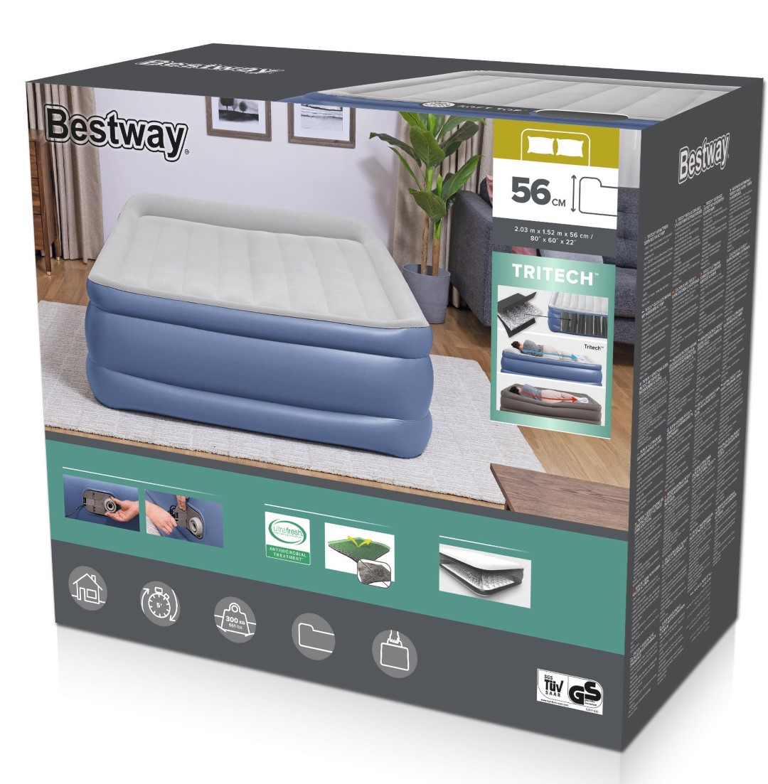 Vakna upp förnyad och utvilad på Bestway® Tritech™ luftmadrass! Denna Queen size-säng lovar styrka, hållbarhet och komfort hela natten lång. Dess kompakta storlek och inbyggda pump gör den snabb och bekväm att använda när du behöver den. Dessutom, med Ultra-Fresh ™ antimikrobiell behandling, kommer din säng att skyddas mot tillväxt av luktframkallande bakterier, mögel och mögel på sovytan.