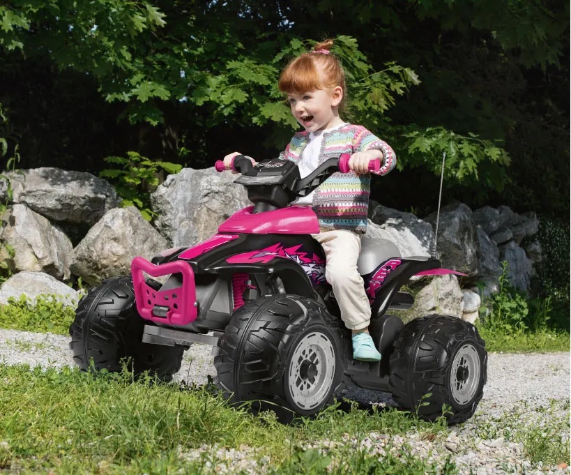 Den djärva elektriska fyrhjulingen för barn med ljus och ljud. Corral T-Rex 330W är den ikoniska Peg Perego-fyrhjulingen som alltid är redo för nya äventyr. Italiensk kvalitet och högpresterande funktioner som lampor, ljud, melodier och ett horn, för mycket skoj från 3 års ålder. Den eldrivna fyrhjulingen drivs med ett uppladdningsbart batteri på 12 V/8 Ah/100 Wh.