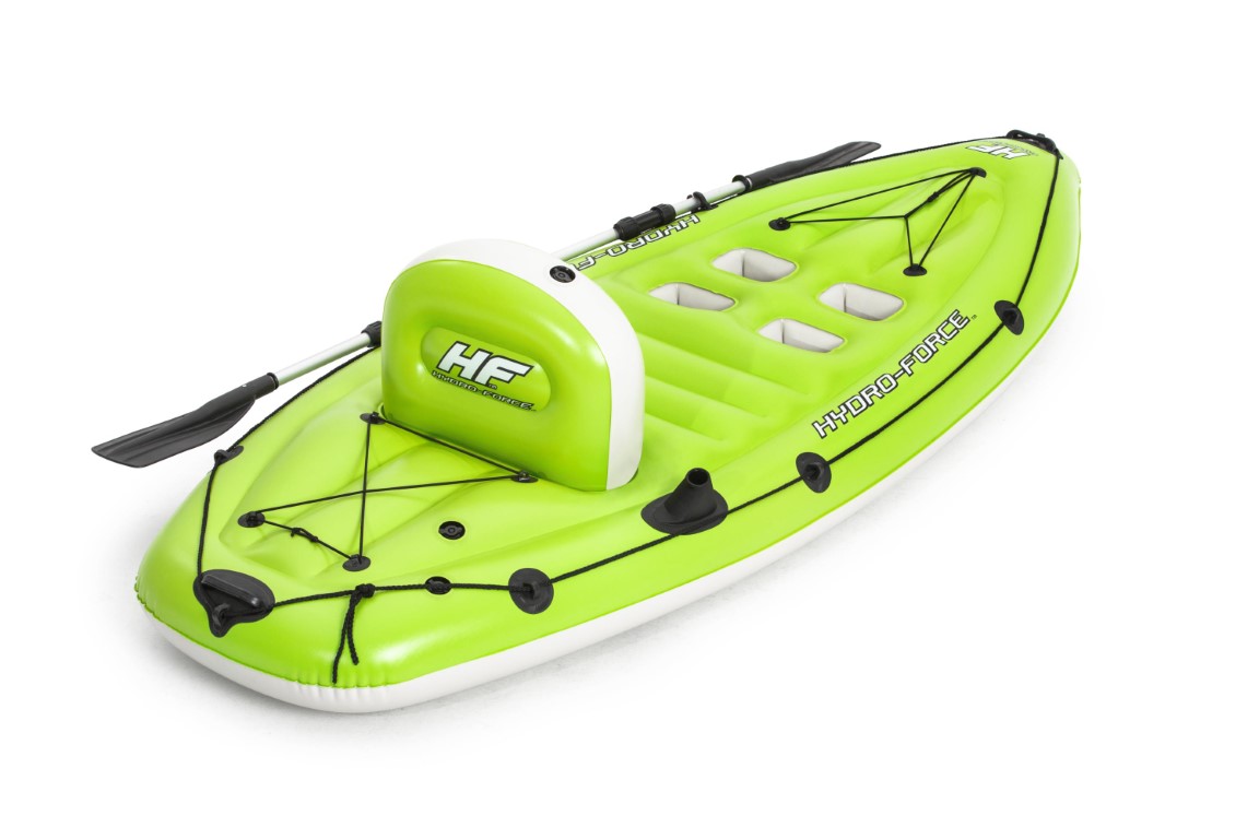 Det finns inget bättre än att koppla av på vattnet och fiska hela dagen lång. Nu kan du fiska bekvämt med den praktiska uppblåsbara fiskekajaken Hydro-Force™ Koracle. Tillsammans med en inbyggd fiskespöhållare och årderspänne har denna kajak också ett uppblåsbart ryggstöd för ultimat avkoppling. Det finns också 4 fotstöd för användare av alla höjder, så alla som använder den här kajaken utlovas förstklassig komfort. Koracle-kajaken är så praktisk som den kan bli. Det är bara att blåsa upp den när du är redo att använda den och tömma den när du är klar. Den är perfekt för transport och kompakt förvaring. Dessutom är ryggfenan avtagbar, vilket gör det ännu enklare att förvara kajaken. I satsen ingår också en Air Hammer™-handpump för snabb och enkel uppblåsning, en paddel och en reparationslapp.