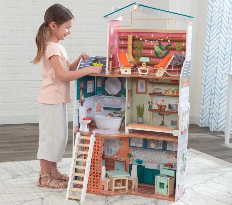 KidKraft Marlow dockhus är hippt och roligt och redo att glädja barnen med timmar av låtsaslekar. Med tre våningar och en samling färgglada moderna möbler har detta hus massor för 12-tums / 30 cm dockor att upptäcka. Med en rörlig trappa, fungerande ljusslingor på uteplatsen, skjutbar genomskinlig dörr och en spis med ljud och ljus kommer magin till liv efter varje upptäcktsfärd. Inredningen är genomtänkt för att göra den relevant och hemtrevlig på samma gång. (Lägg märke till diskhon på bondgården, kakelplattorna och chimenea!) Barnen kan till och med göra inredningen personlig med de statiska klistermärkena som kan tas bort och sättas fast om och om igen. Se hur barnen blir upprymda av att leka med Marlow Dollhouse.
