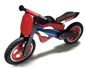 Balanscykel i trä av hög kvalitet med riktiga hjul med luft, precis som på vanliga cyklar.