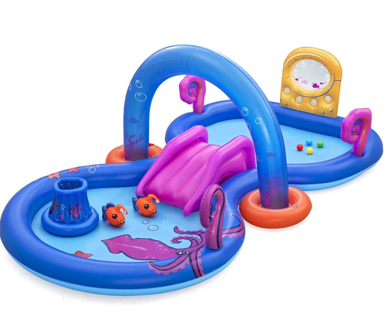 Gör dig redo för en djupdykning i det roliga med Bestway® Sea Odyssey™ Play Centre! Detta lekcenter med djuphavstema och 2 lekpooler som är förbundna med en flyttbar uppblåsbar rutschkana är precis vad ditt barn drömmer om under vattnet. Den interaktiva bollsorteringsväggen får dem att känna sig som i en ubåt som söker genom djupt vatten medan de tränar sin finmotorik genom att sätta in de 4 lekbollarna i väggens hål. De kommer att plaska i timmar när de spelar pickleball med de 2 avtagbara paddelracketarna och spelbollarna. De kan försvara sitt skepp genom att använda bläckfiskens tentakelslinga för att kasta in lekbollarna i den rörliga korallkorgen. När barnen är redo att leka kan de ta tag i de 2 havsfiskarna från Puffy Pal™ och kasta dem i korallkorgen. Den inbyggda, avtagbara bågsprinklern kan enkelt anslutas till en trädgårdsslang för att hålla igång vattnet och de roliga stunderna. Lekcentret har också en lättanvänd dräneringsventil för att släppa ut vattnet ur poolen, vilket gör det enkelt att ta ner och förvara för senare användning. Barnen kan även använda lekcentret utan vatten, så att de kan ha roligt året runt. Dina barn kommer att älska att plaska hela dagen och utforska sin fantasi med Bestway Sea Odyssey Play Centre.