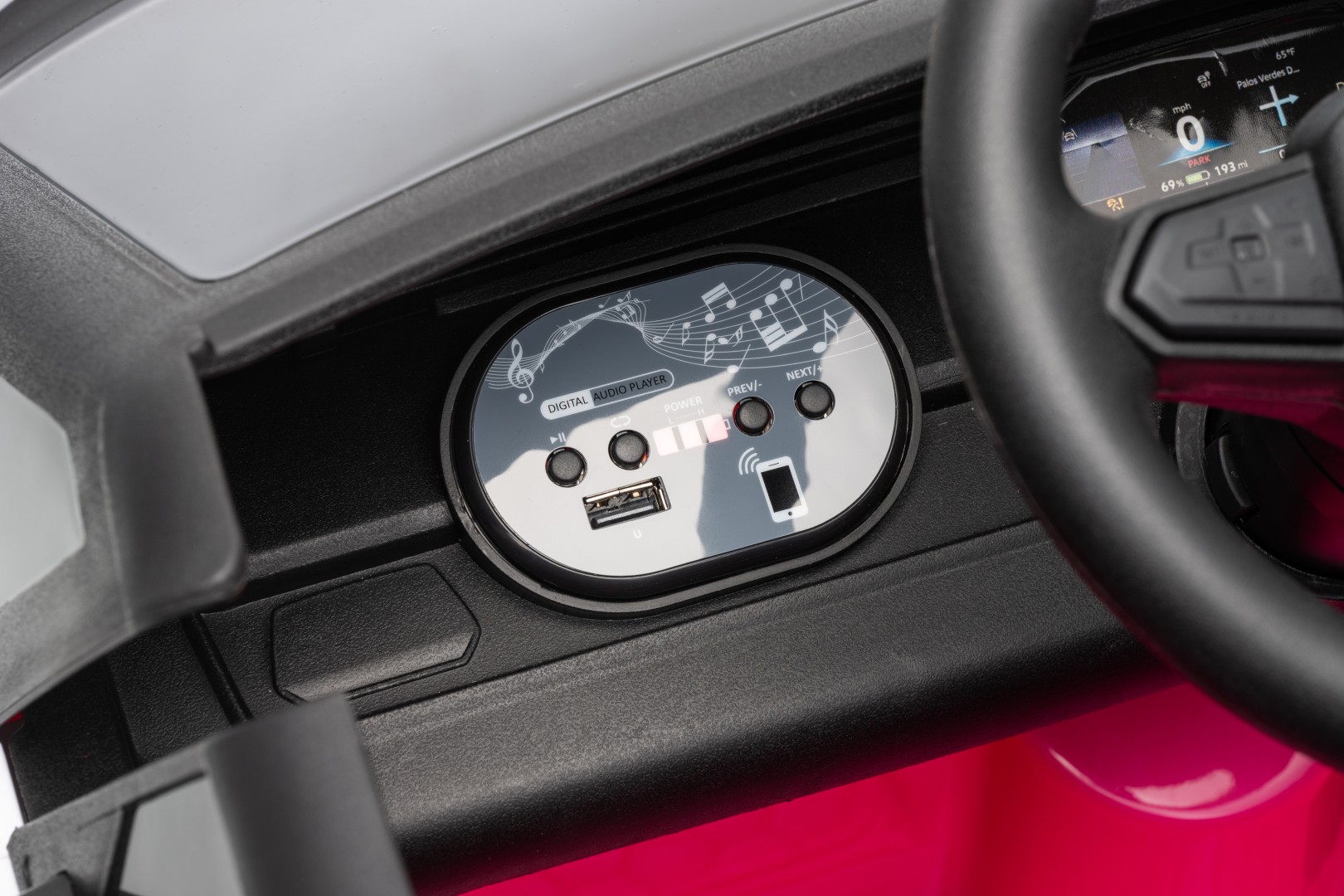 Bilen är utrustad med USB- och AUX-ingång så att ditt barn kan lyssna på sina favoritlåtar medan du kör. Dessutom garanterar de inbyggda högtalarna och musikfunktionen massor av skoj under resan.