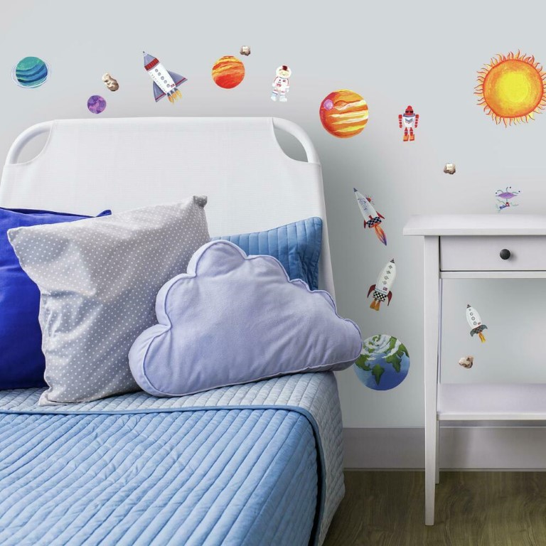 Låt oss ta en raket till en galax med färgglada planeter och träffa några vänliga utomjordingar och robotar på vägen. Skapa din egen Outer Space sceniska väggmålning med denna uppsättning omplacerbara väggdekaler. Hoppa ombord på det rymdskepp du väljer och utforska universum ... allt på dina väggar! Och när du är redo för ett nytt äventyr kan du flytta runt motiven och börja om från början.